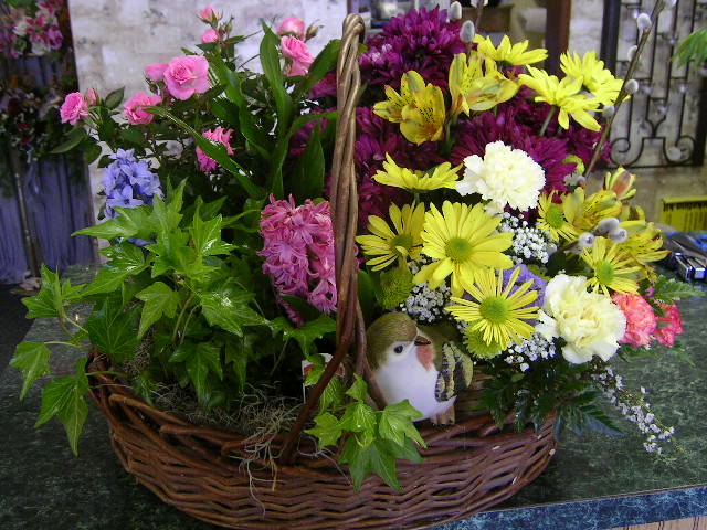 silk flowers & a bird.