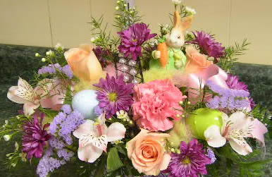 Gardeny mix of fresh flowers in pastel colors includes easter accents.